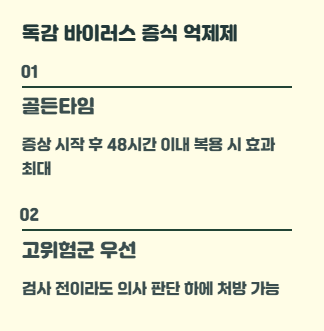 - 증상 시작 후 48시간 이내 시작할수록 이득이 커지는 편