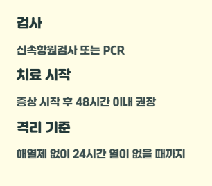 | 검사 | 신속항원검사 또는 PCR(의료기관 판단) | 초기/검체에 따라 음성도 가능해 증상·유행 상황을 같이 봅니다. |