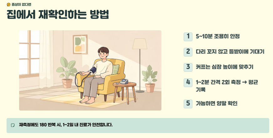 이렇게 했는데도 혈압 180이 반복된다면 “괜찮겠지”로 넘기기보다는 늦어도 1~2일 내 진료가 안전합니다.