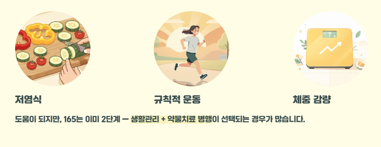 체중 감량, 저염식, 운동은 분명 도움이 됩니다. 하지만 165는 이미 2단계 구간이기 때문에 생활관리와 약물치료를