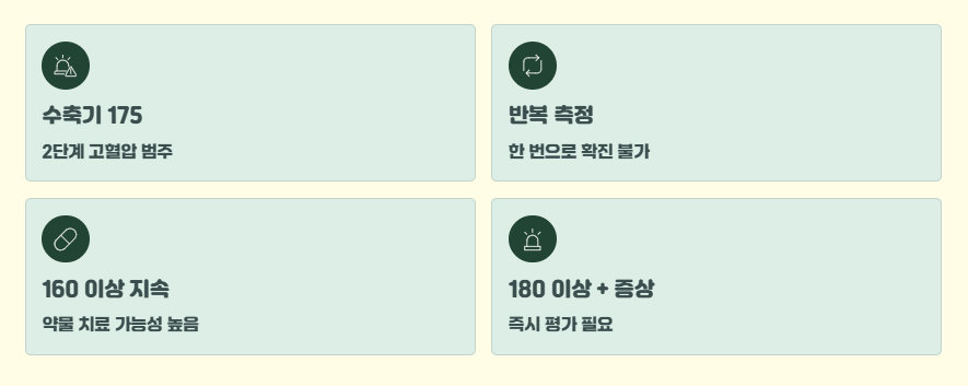 혈압 175는 2단계 고혈압 범주에 해당합니다. 한 번의 수치라면 반복 측정으로 평균을 확인하세요. 하지만 160 이상이 지속된다면, 치료 계획을 세우는 것이 안전합니다.