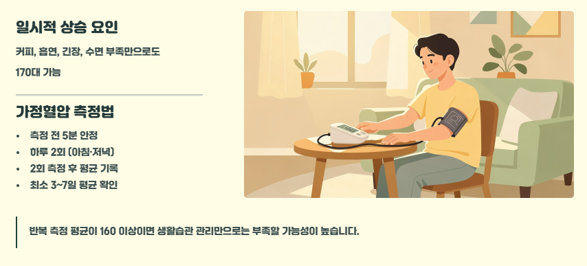 커피, 흡연, 긴장, 수면 부족만으로도 일시적으로 170대가 나올 수 있습니다. 그래서 가정혈압으로 최소 3~7일 평균을 확인해야 합니다.